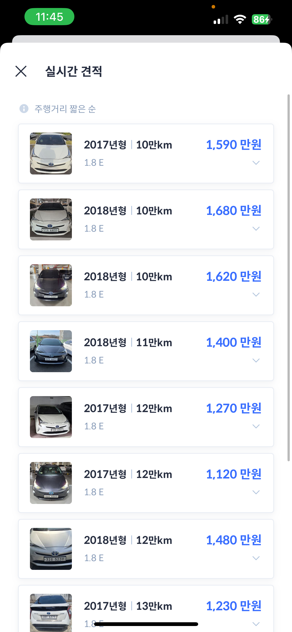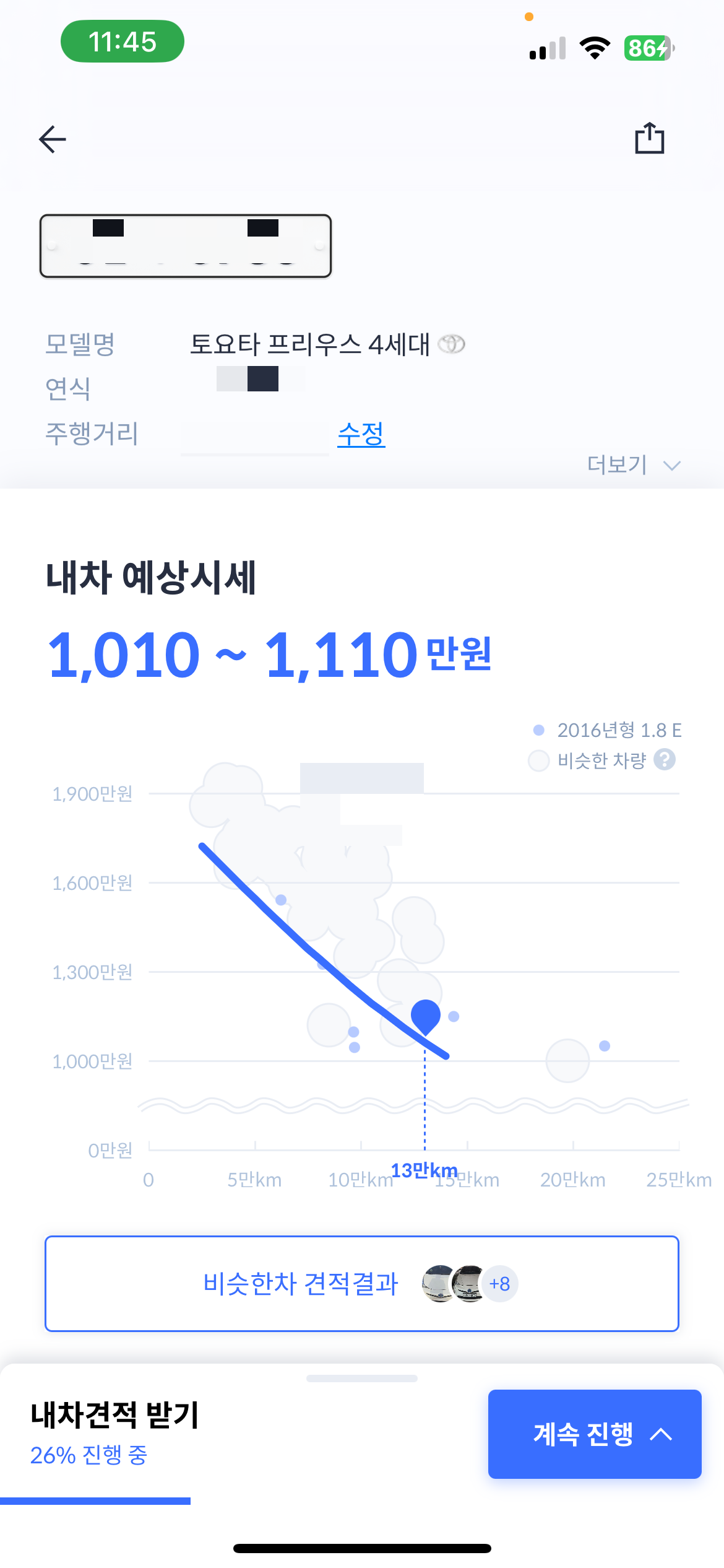 본인 소유의 차 번호를 입력하면 연식과 주행거리에 따른 예상 시세가 나오며 같은 모델의 다른 차량의 시세도 바로 확인이 가능합니다.