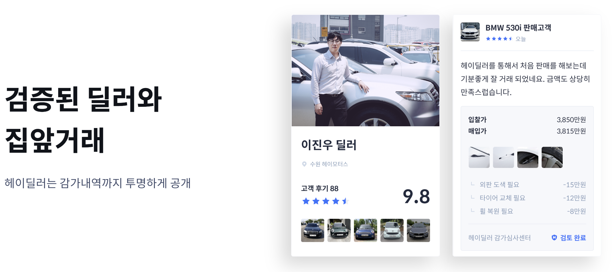 어렵고 불편하던 중고차 거래를 쉽고 안전하게 바꾸겠다라는 모토로 출발한 헤이딜러는 어플을 통해 현재 중고차 시세를 알아볼 수 있습니다. 특히 중고차를 구매할때는 중고차 숨은이력 찾기를 통해 알기 어려웠던 이력을 쉽게 조회가 가능한 서비스를 제공하고 있습니다.