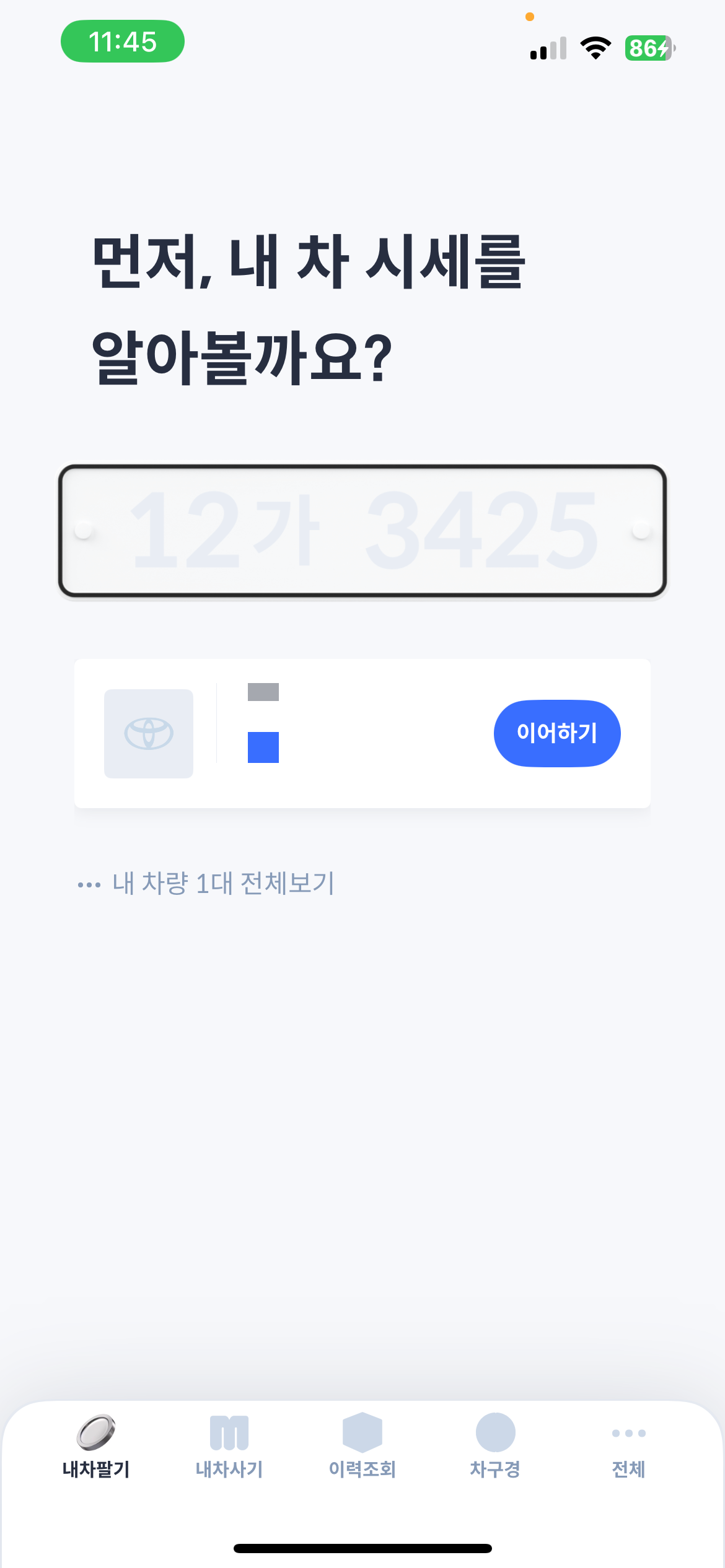 본인 소유의 차 번호를 입력하면 연식과 주행거리에 따른 예상 시세가 나오며 같은 모델의 다른 차량의 시세도 바로 확인이 가능합니다.